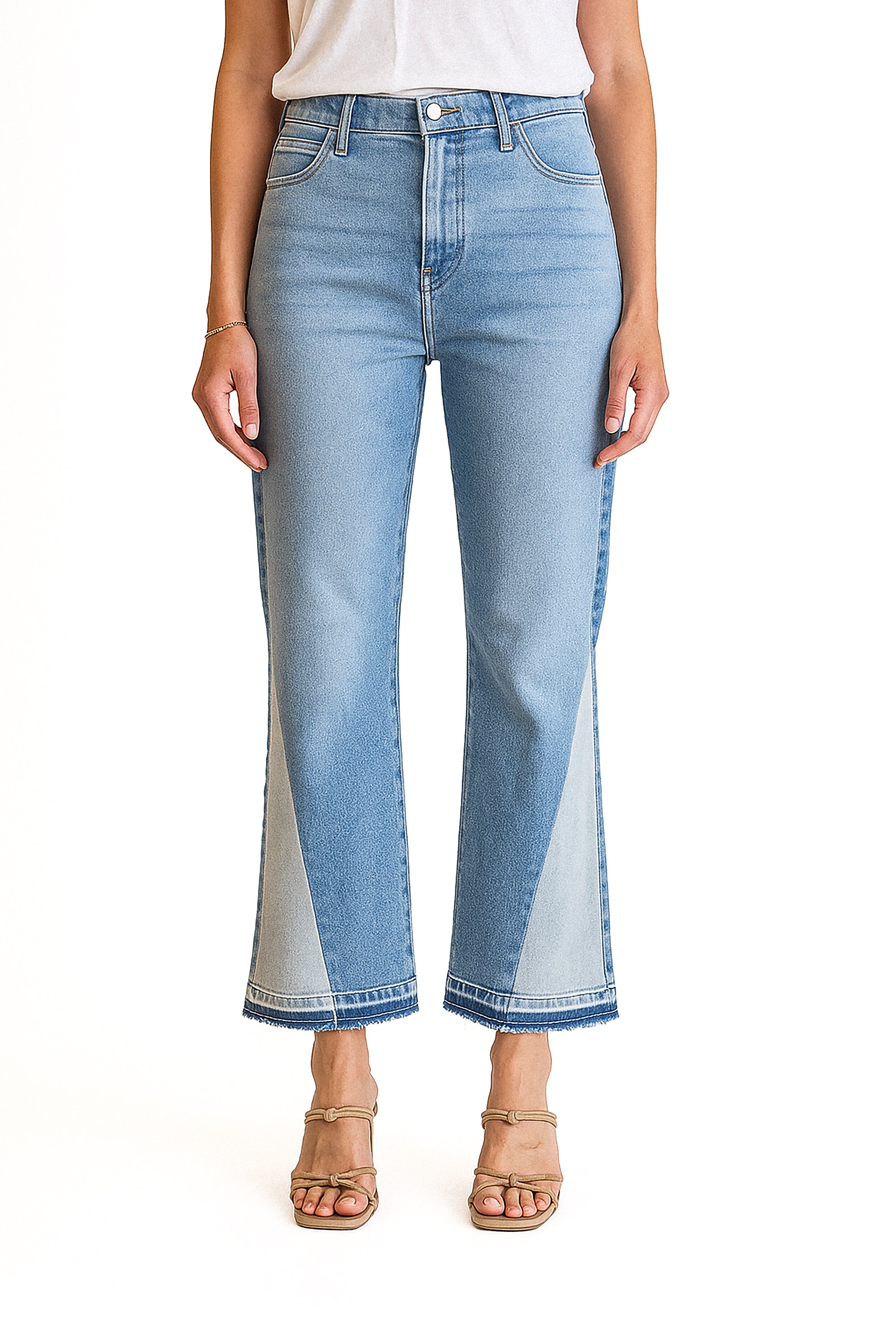 The Britt is a full-leg silhouette featuring a bold contrast triangular panel along the side seam, adding a striking architectural twist to a timeless shape."