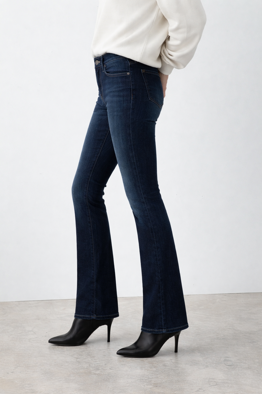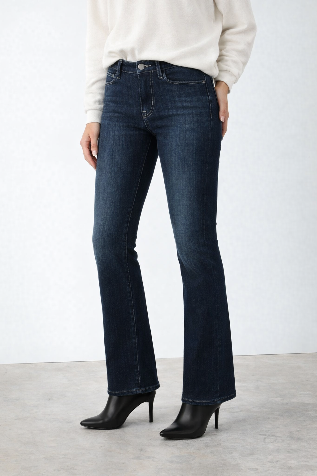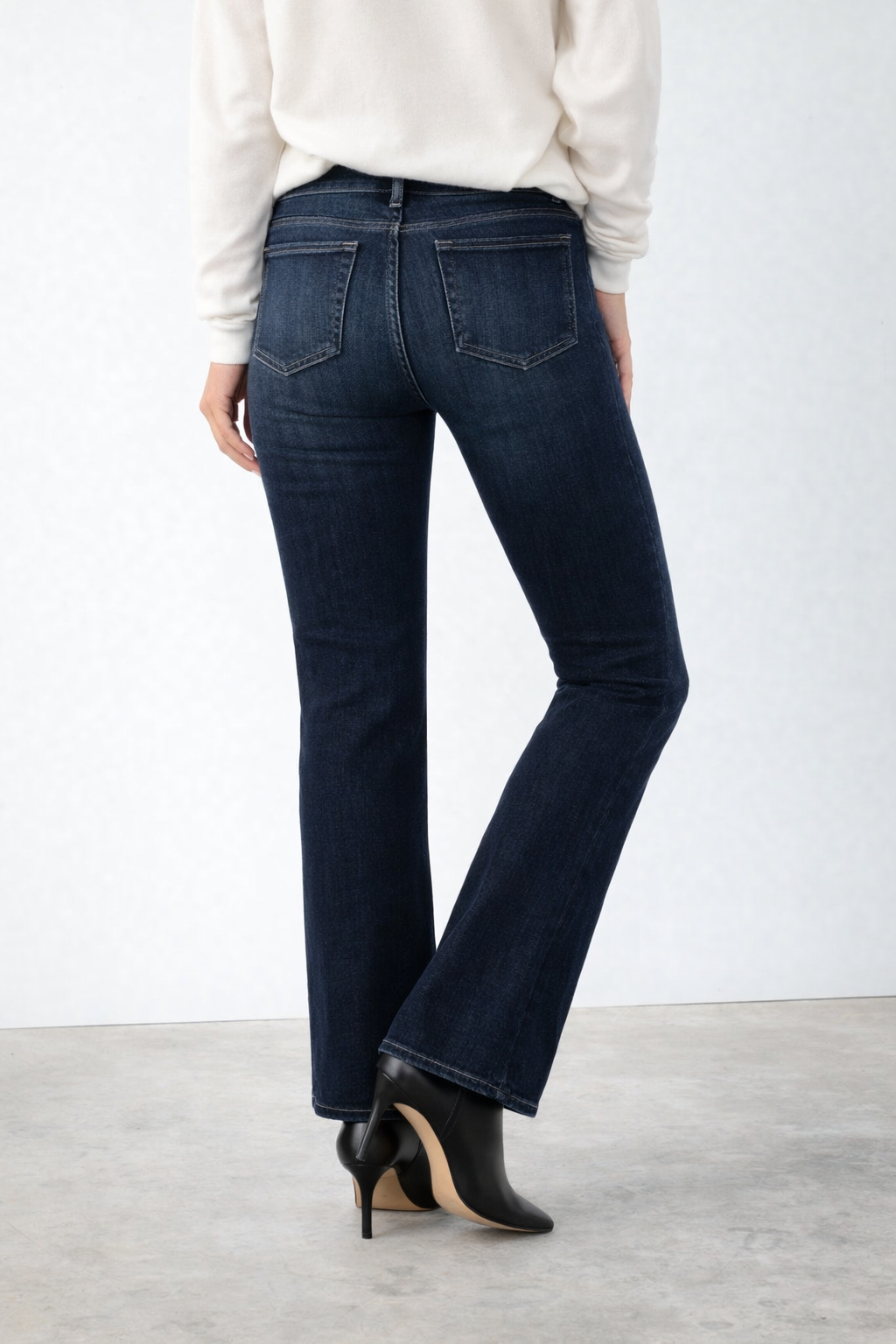 Lily is a mid-rise bootcut with a clean fit through the leg and a subtle flare below the knee.