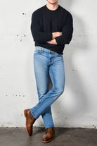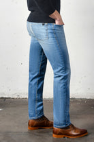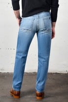 Shelby is a classic medium blue wash with a subtle grey undertone that adds a cool, modern edge. Softly faded with minimal abrasion, it strikes a perfect balance between worn-in ease and everyday polish. The result is a versatile, laid-back wash that pairs effortlessly with everything—casual, clean, and endlessly wearable.