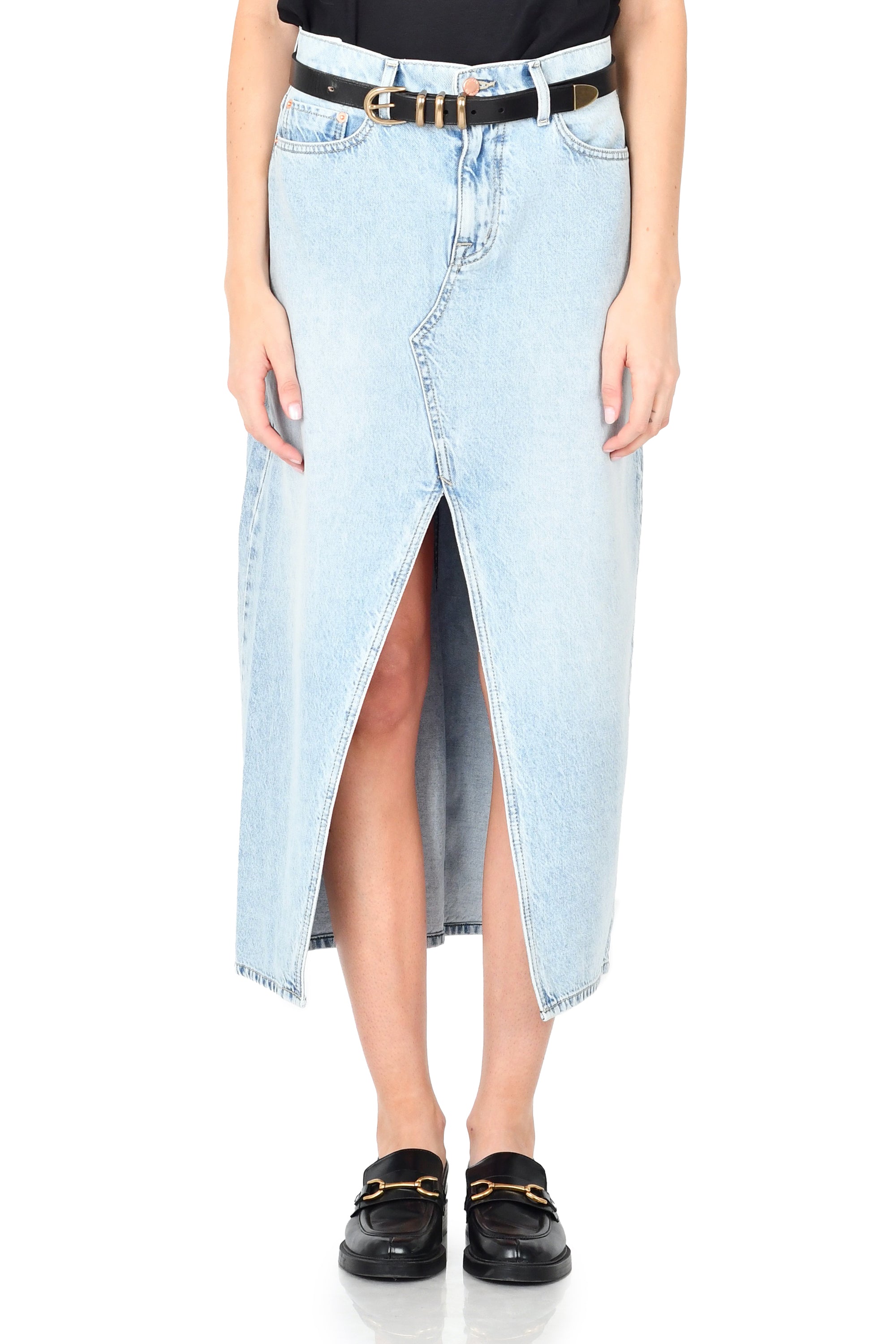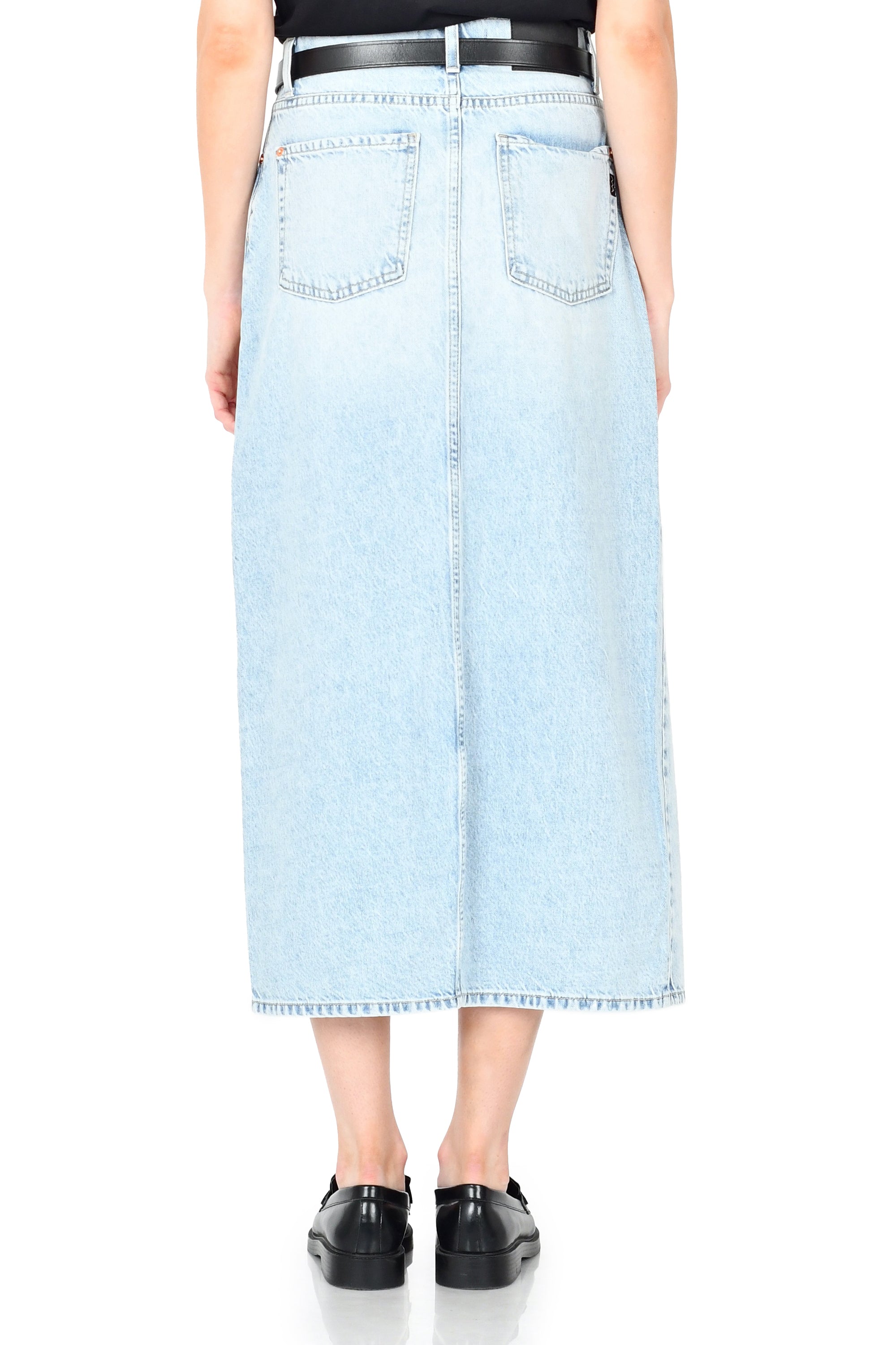 The Maxine skirt is a high waisted, midi skirt with a fitted waist, front slit in a light blue wash.