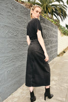 The Maxine skirt is a high waisted, midi skirt with a fitted waist, front slit in a washed black.