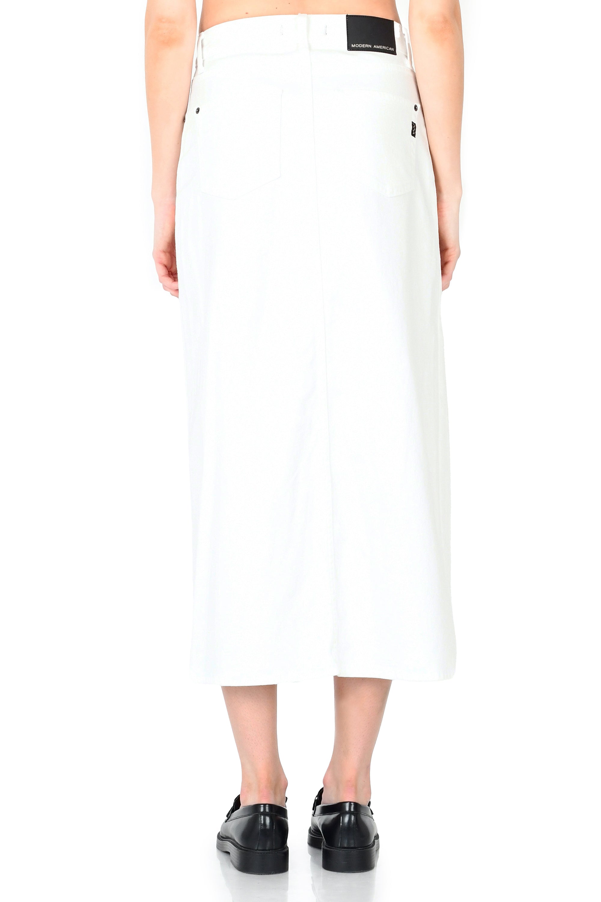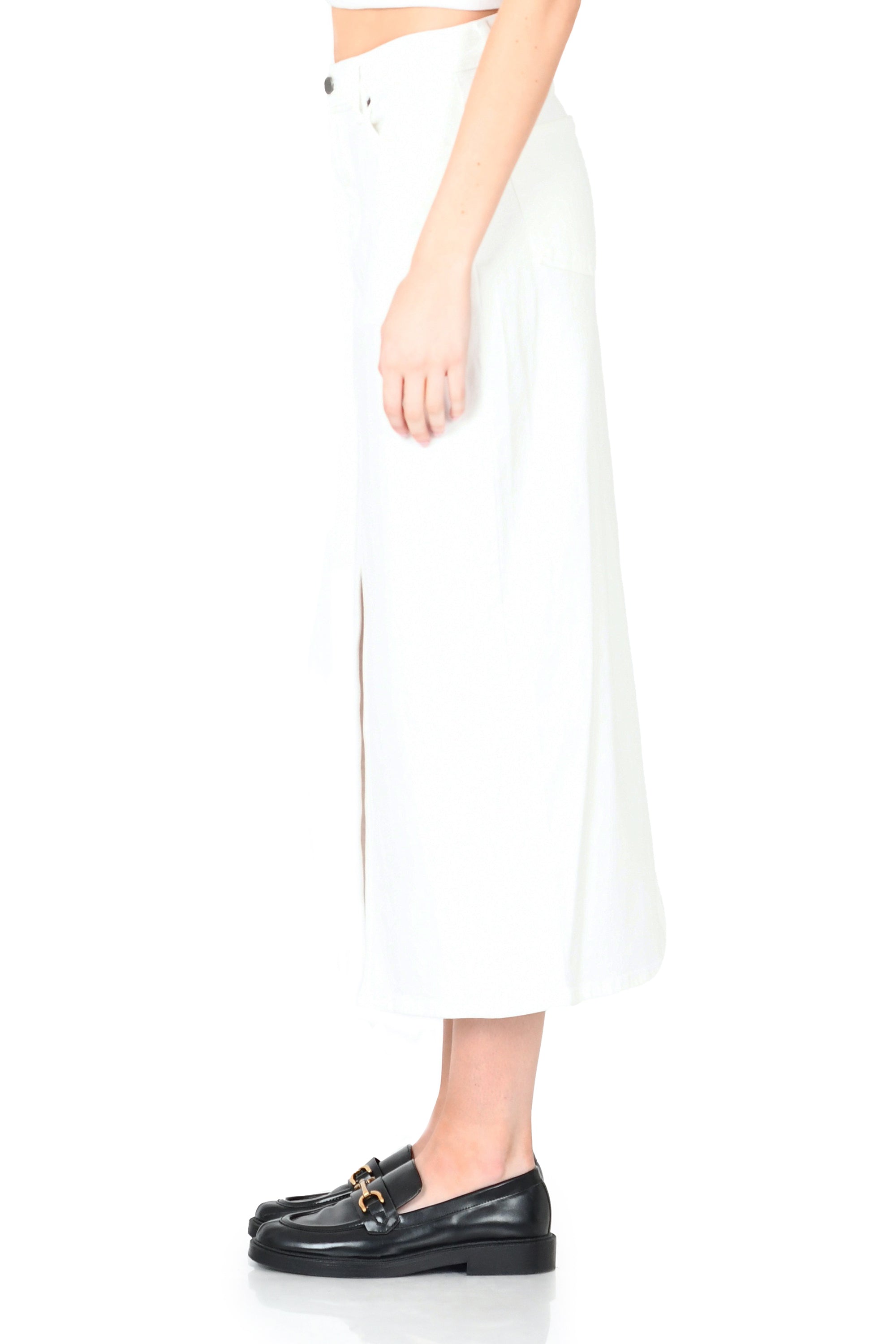 The Maxine Skirt is a high waisted, midi skirt with a fitted waist, front slit in a fresh and clean color.