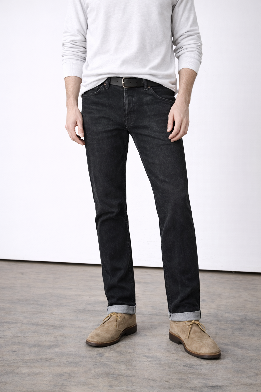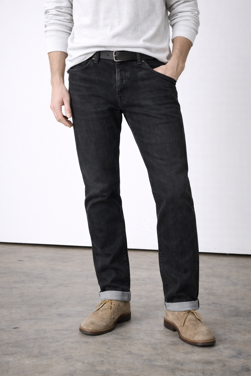 Jimmy Selvedge is a modern straight fit jean with a slight taper, made with stretch for easy movement, no long break-in, and built to cuff and show the selvedge line.
