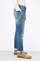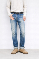 Patchouli Wash is a selvedge denim with a rich medium fade and natural wear from washing and use.