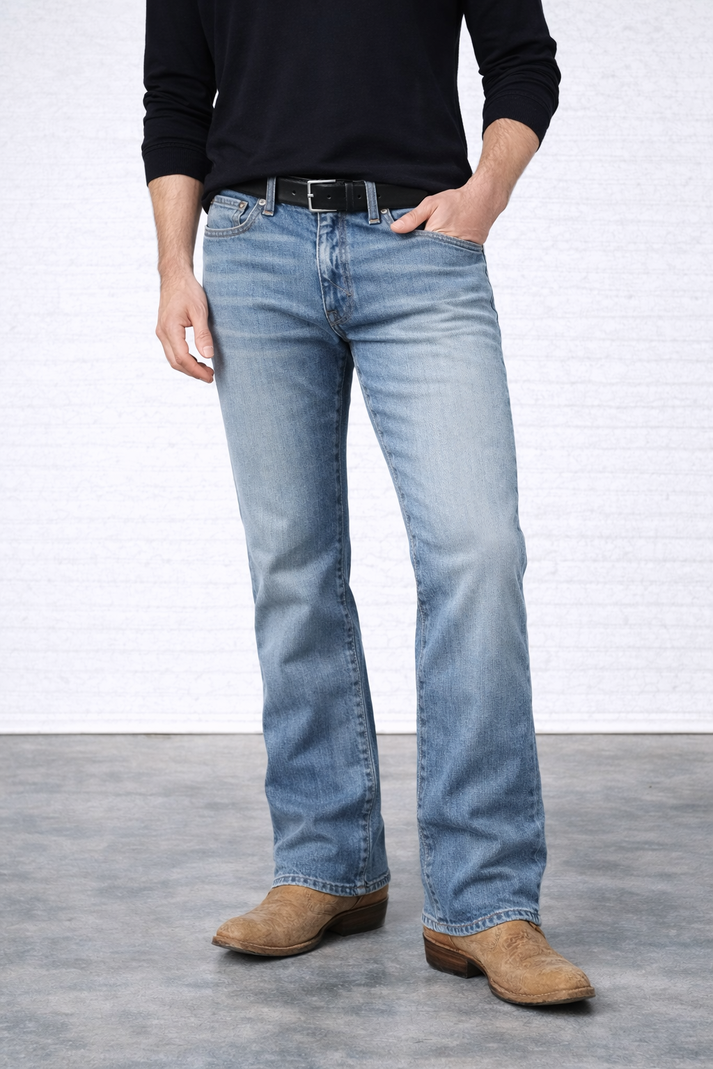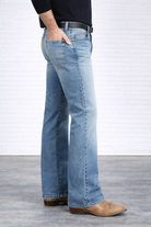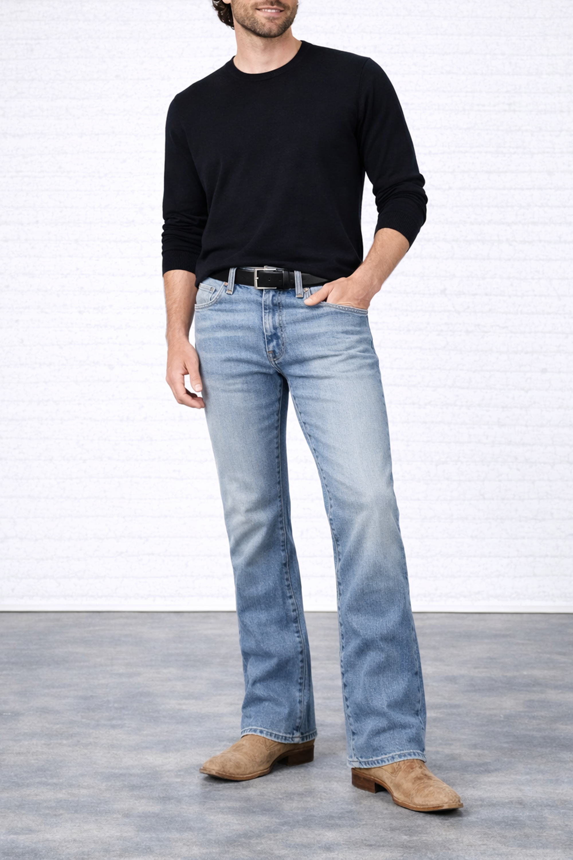 The Firebird is a bootcut flare with a close fit through the hip and thigh, finished in comfort stretch denim with soft whiskering and a sun-faded wash.
